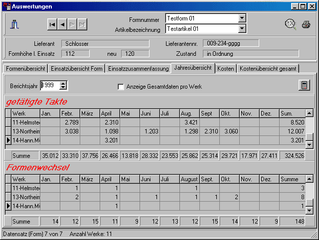 des Buttons Filter Die angezeigte Datenmenge läßt sich nach dem Berichtsjahr filtern. Ist das Checkfeld "Anzeige Gesamtdaten pro Werk" aktiviert, werden die summierten Einsatzdaten aller Formen angezeigt. |