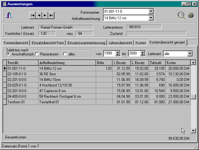 In diesem Formular wird eine Übersicht der Kosten aller Formen generiert. Filter Die angezeigte Datenmenge läßt sich nach folgenden Kriterien filtern: