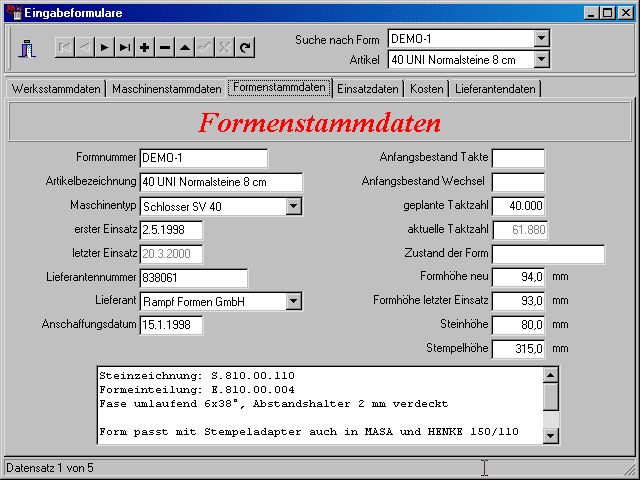Die Felder Maschinentyp und Lieferant sind Pull-Down Felder,