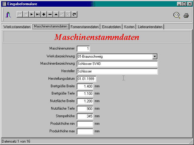 Hier werden die Stammdaten der einzelnen Maschinen eingetragen. Das Feld Werksbezeichnung ermöglicht eine Selektion der in den Werksstammdaten erfaßten Werke.